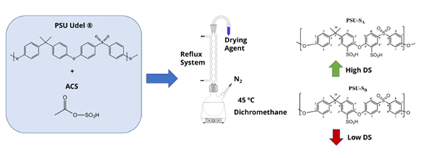 In this work, the authors present as an innovation, the homogeneous sulfonation of Udel® polysulfone (PSU) with acetylsulfate (ACS) under reflux at 45°C in dichloromethane and inert N2 atmosphere (g) for 1.5 h. Different proportions of ACS were used, obtaining sulfonated products with varying degrees of sulfonation (DS). Confirmation of sulfonated polysulfone (PSU-S), denominated as PSU-SA (high degree of sulfonation) and PSU-SB (low degree of sulfonation), was carried out by FTIR and 1H NMR. Determination of DS was carried out through thermogravimetric analysis (TGA/DSC), varying indexes between 0.883 and 3.022, which correspond to a sulfonated polymer with ion exchange capacity (IEC) from 1.720 to 4.400 meq/g. The evolution of DS related to methods used was monitored and confirmed by 1H NRM. Sulfonation is undertaken to enhance the suitability of this polymer for future applications in the production of biofuels, targeting its utilization in catalytic processes for esterification and transesterification mechanisms of oils and fats.