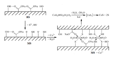 In recent years, spent kieselguhr and activated carbon are considered not as waste, but as secondary raw materials. The purpose of the work is to investigate the effectiveness of using a previously regenerated spent food industry sorbent modified with sulphide and hydrosulphide ions for adsorption removal of copper (II) ions from water. A comparative analysis of the degree of removal and adsorption of copper (II) ions by the regenerated sorbent (RS) and its modified form (MS) was carried out. Insignificant adsorption of Cu2+ on the surface of the regenerated sorbent (RS) is explained both by the nature of the adsorbate and the morphology of the adsorbent after its acid-alkaline activation. Sorption of Сu2+ ions is mainly carried out by carboxyl groups. Modification of the regenerated sorbent surface with more active sulphide and hydrosulphide ions leads to a significant increase in its selective adsorption in relation to copper (II) ions. It was established that topochemical reactions of formation of copper (II) sulphide CuS and elemental sulphur take place on the surface of the modified sorbent (MS). The possibility of topochemical transformations has been established by IR-spectral and XRD studies. The use of a sorbent modified with sulphide and hydrosulphide ions increases the removal of copper (II) cations from the studied solutions by 65.5 times. The obtained results allow us to recommend the use of a regenerated sorbent (RS) of the food industry, modified with sulphide and hydrosulphide ions, to remove copper (II) ions from water.