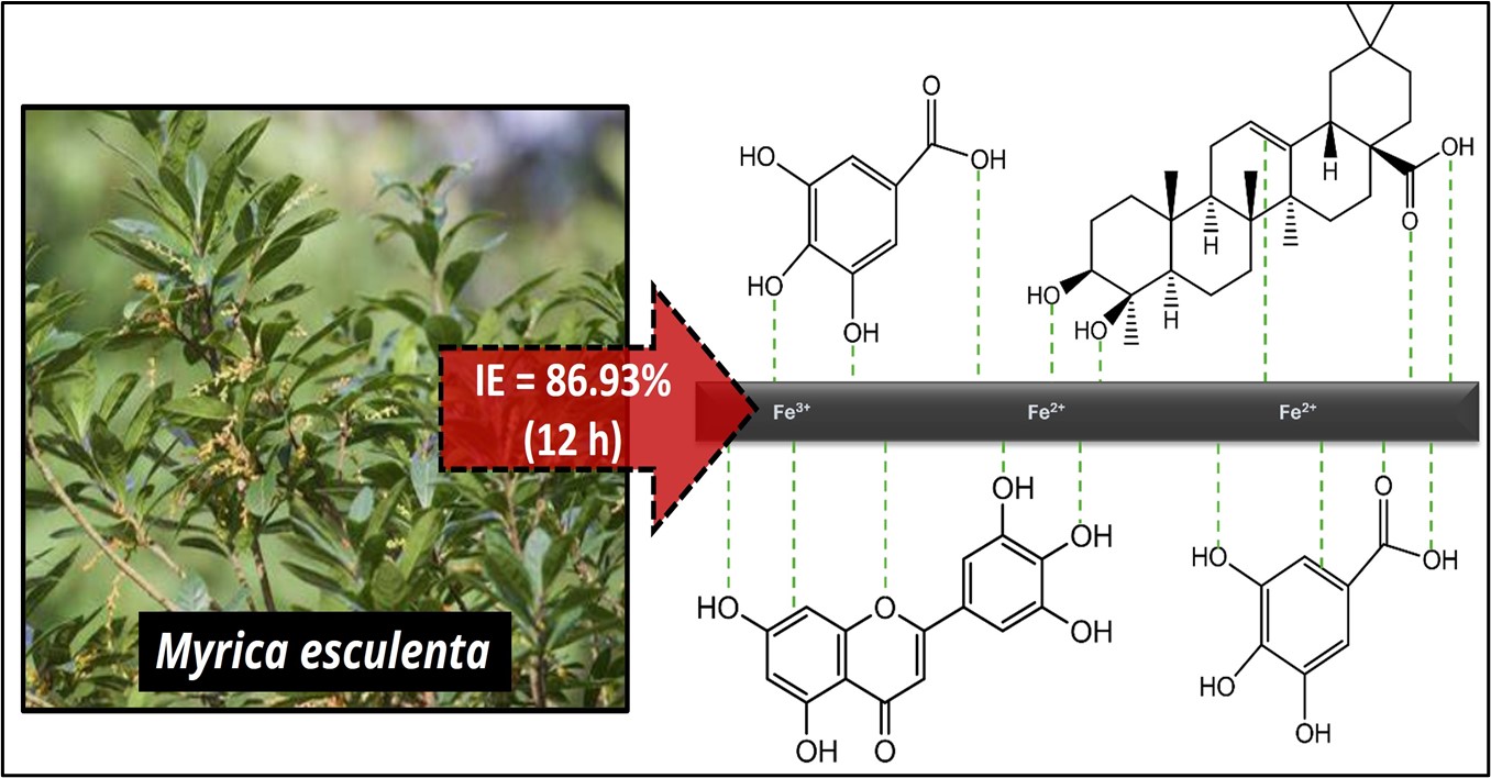 Corrosion of mild steel (MS) in acidic environments presents a significant challenge in industrial applications, often leading to structural degradation and economic losses. This study investigated the effectiveness of Myrica esculenta (ME) extract as a green corrosion inhibitor for MS in acidic media. A combination of methods—including weight loss experiments, contact angle measurements, surface analysis, and electrochemical techniques—was employed to evaluate the inhibitor's performance. In the absence of the ME inhibitor, MS experienced rapid corrosion and significant weight loss. However, the addition of ME extract, particularly at a concentration of 40 mg/L, markedly reduced corrosion, achieving an inhibition efficiency of 86.93% after 12 hours. Electrochemical polarization studies revealed a shift in corrosion potential toward more noble values, indicating a reduced tendency for corrosion. Adsorption studies suggested that the inhibitor formed a protective layer through both monolayer and possible multilayer adsorption mechanisms. Contact angle analysis showed an increase in surface hydrophobicity, confirming the formation of a protective interface layer. UV analysis further validated the presence of this layer, which played a crucial role in minimizing pitting and preserving the structural integrity of the mild steel surface. These findings underscore the potential of ME as an effective and environmentally benign corrosion inhibitor.