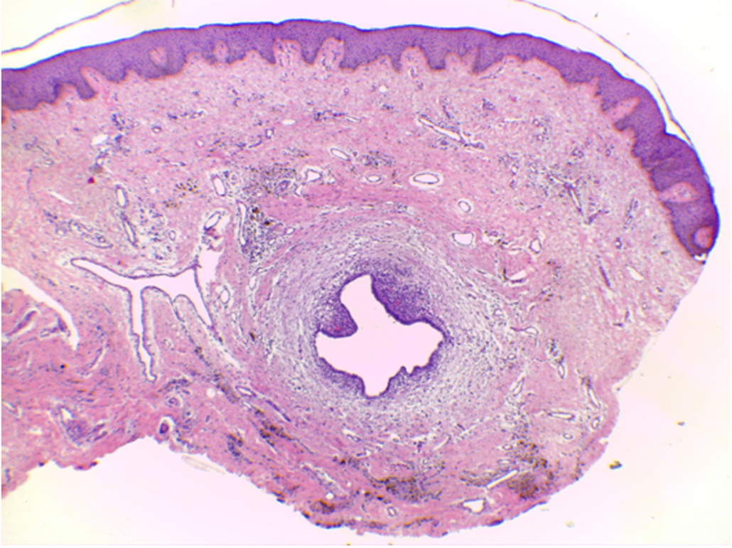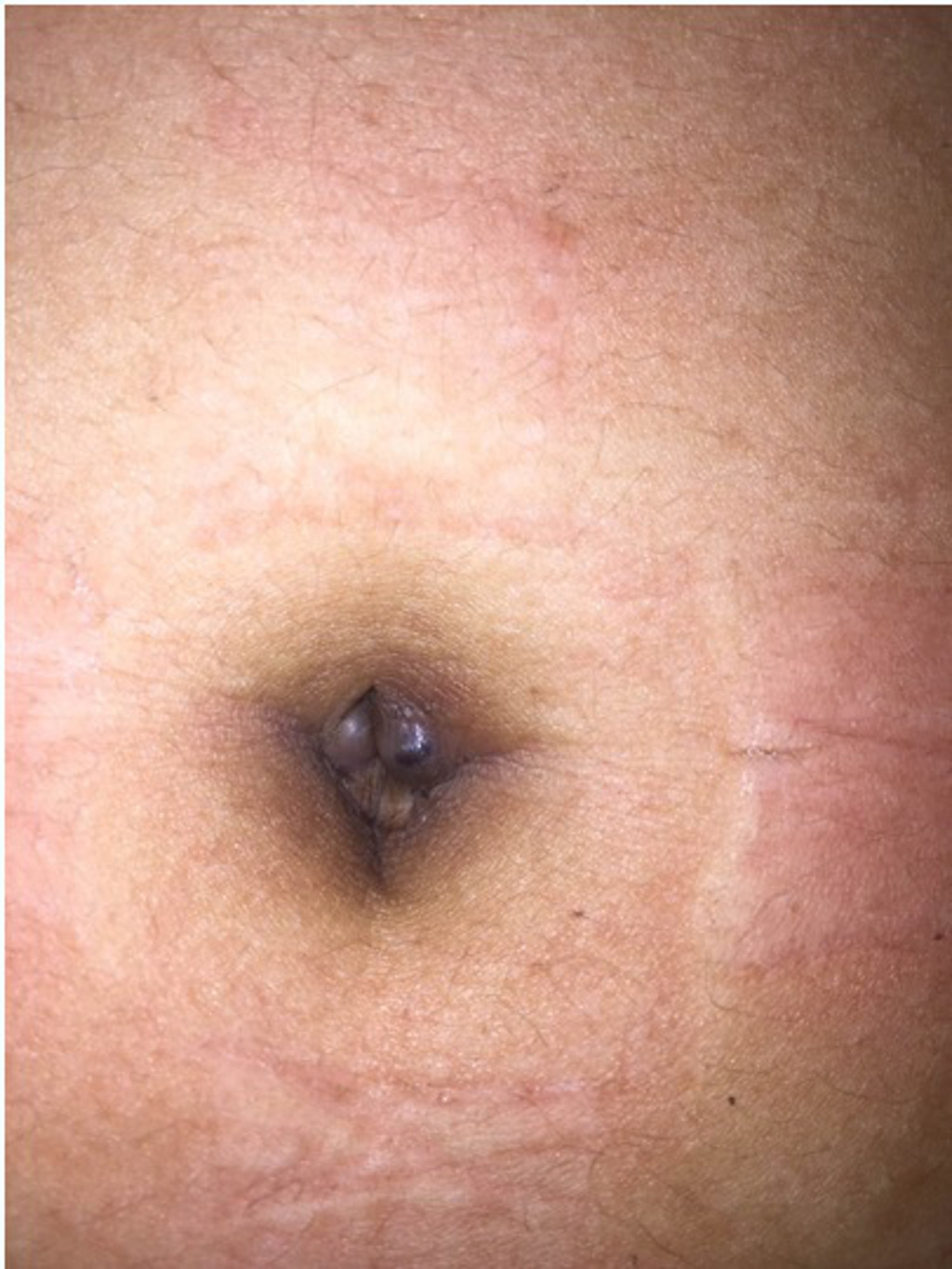 A endometriose é definida como a presença de tecido endometrial funcionante (glândulas e estroma) fora da cavidade uterina, com prevalência de 12% em mulheres em idade fertil. A endometriose cutânea é rara, cerca de 1% do total, porém constitui uma das localizações extra pélvicas mais comuns, sendo classificada em formas primária, espontânea, e secundária. Relata-se um caso raro de endometriose cutânea umbilical primária e ressaltar a importância do diagnóstico precoce para o prognóstico. Relato de caso: Paciente feminina, 32 anos, sem cirurgia abdominal prévia, com história de pápulas eritemato-hipercrômicas com variação de volume em região umbilical, associadas à dor e sangramento local, não relacionada ao ciclo menstrual há 3 anos. Apresentando na histopatologia epiderme sem alterações e derme com tecido endometrial, melanófagos e hemossiderina, compatível com diagnóstico de endometriose cutânea. Discussão: Quanto mais precoce seja o diagnóstico, menor será a necessidade de incisão e ressecção ampla de tecidos. Ainda que de incidência rara e desconhecida, não pode-se esquecer da possibilidade de malignização, que é mais frequente em mulheres com lesões de longa duração não tratadas.