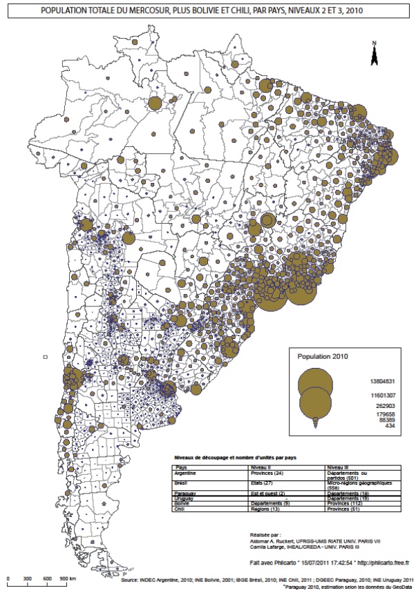 ______.; LAFARGUE, Camila. Population totale du Mercosur plus Bolivie et Chili, par pays, niveaux 2 et 3, 2010. Paris: Université Paris VII et Univeristé Paris III, 2011. (Carte).