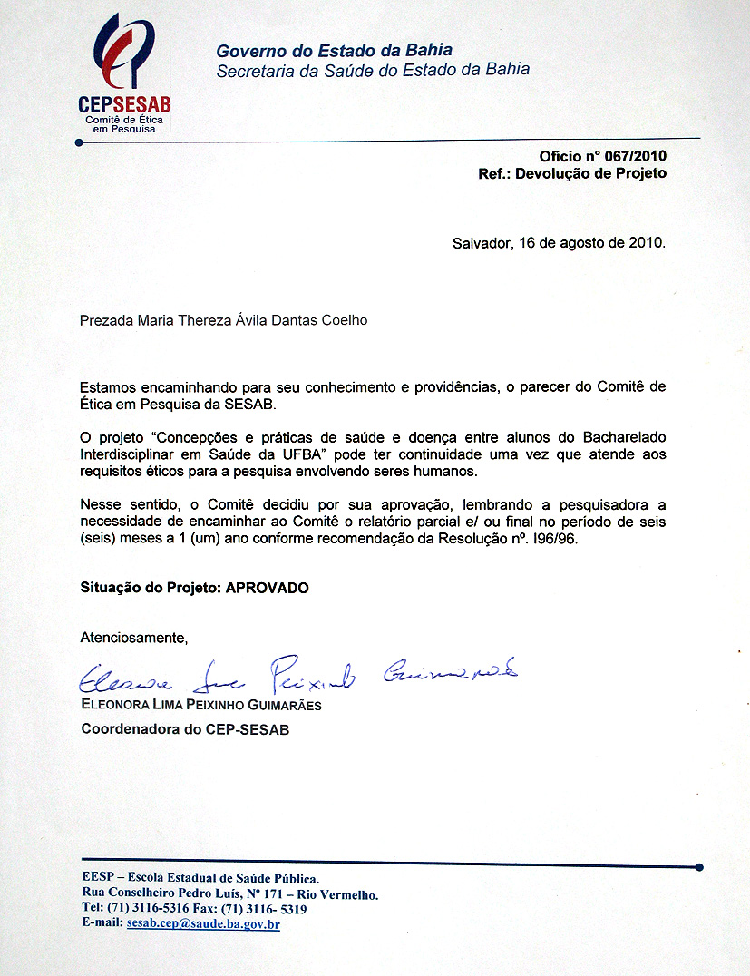 Coelho MTÁD, Santos VP, Rocha DMP, Teixeira F de S. Concepções e práticas de saúde e doença entre alunos da primeira turma do Bacharelado Interdisciplinar em Saúde da UFBA. In: Teixeira, C de F, Coelho MTÁD (Orgs.). Uma Experiência Inovadora no Ensino Superior: Bacharelado Interdisciplinar em Saúde. Salvador: EDUFBA; 2014. p. 207-17.